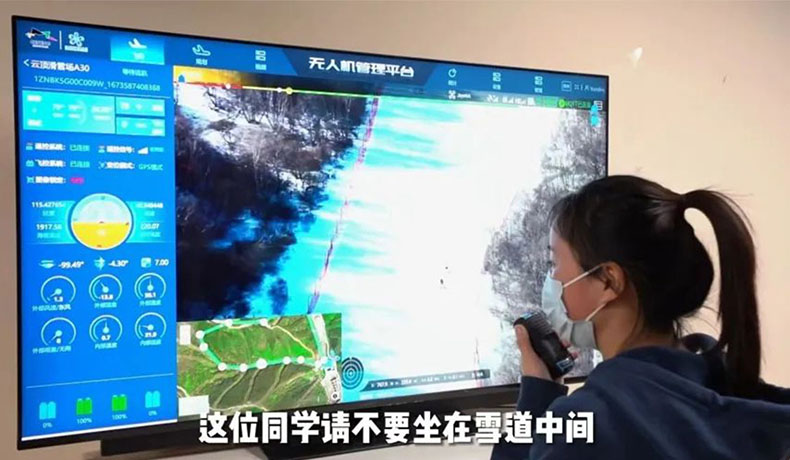 “各位雪友注意啦,這里是高級道,前刃摔了廢屁股,后刃摔了廢胸……能不能滑心里有點數哦!”在云頂滑雪場指揮部里,電子屏幕上清晰顯示著由無人機實時回傳的景區人流量、秩序情況,安防人員通過無人機喊話維護現場秩序,提醒游客注意安全。