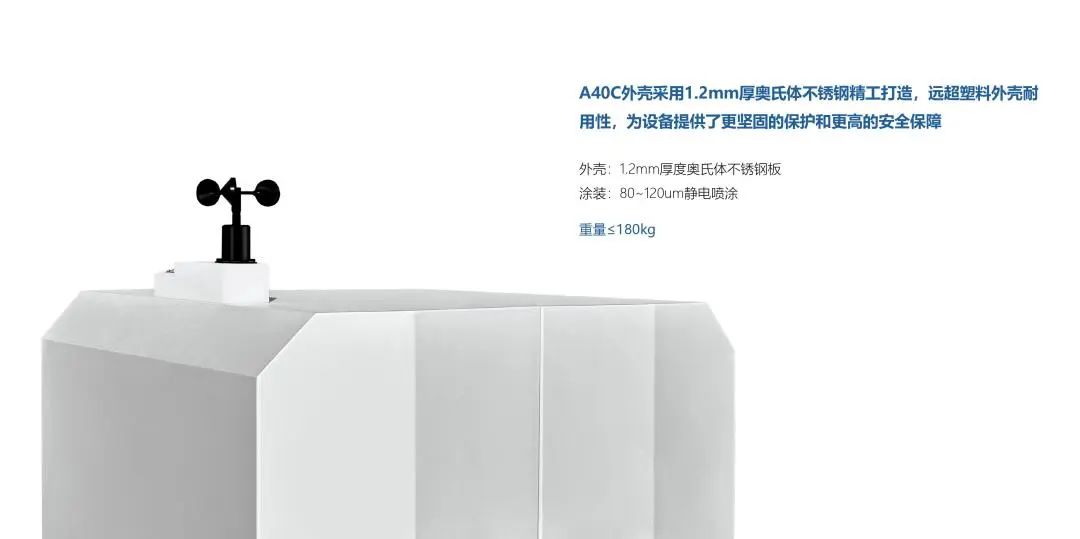 A40C采用1.2mm厚的奧氏體不銹鋼外殼,比傳統塑料外殼更具耐用性,能為設備提供更強的物理保護,搭配整機IP56防護等級,有效防水防塵,適合野外長期的無人值守作業,減少設備維修頻率和更換成本。